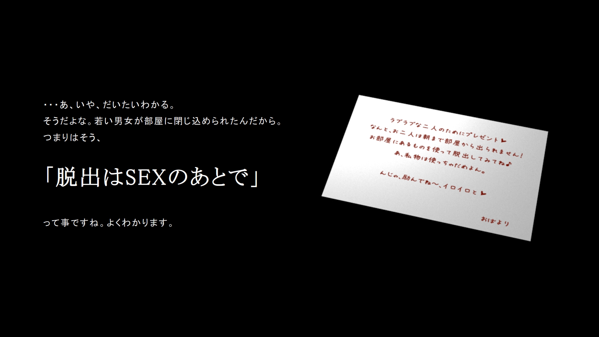 捜索中には恋人といちゃいちゃしたり、入手出来るアイテムもコスプレアイテムだったり、脱出ゲーもといいちゃいちゃゲー。