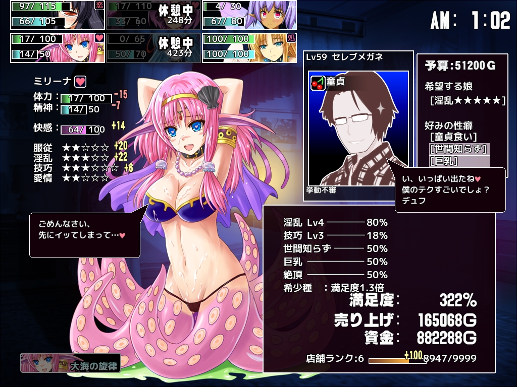 それでも一周目は経営、エロ、シナリオとしっかり作られているゲームなので体験版でピンときたらそのまま楽しめると思う。