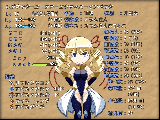 一度えっちしてもHPSTR+1ぐらいしか上がらないのでひたすらレジネッタにえっちな行為をさせ、そして淫乱に強くなっていく。