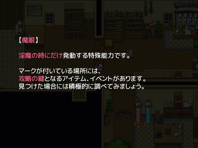 淫魔化状態で発動する「魔眼」で攻略の糸口を見つけたり、時にはヒロインの部屋を覗いてみたり。