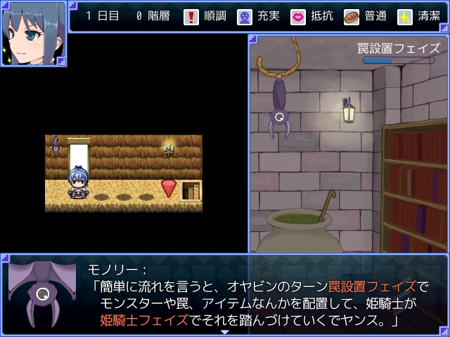 罠設置フェイズでプレイヤーがイベントなどを配置し、姫騎士フェイズでそのイベントを踏みながら進んでいく形。