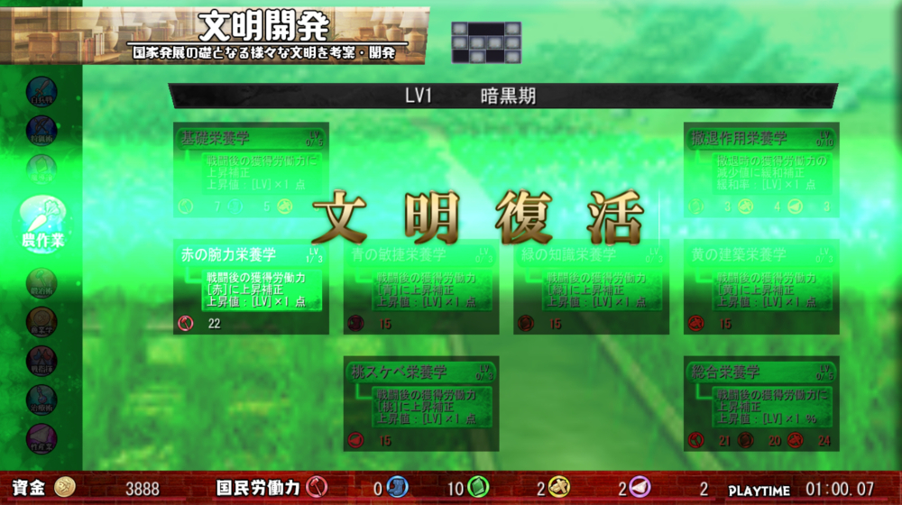 国の発展は「文明開発」と呼ばれるいくつかの項目が用意されており様々な恩恵を得ることができます。