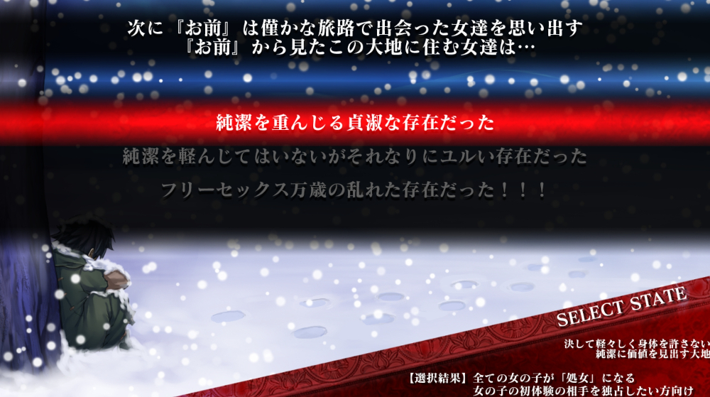 最初の主人公選択時には全キャラクターを処女の状態にすることも可能で誰にも渡さない独占プレイも可能。