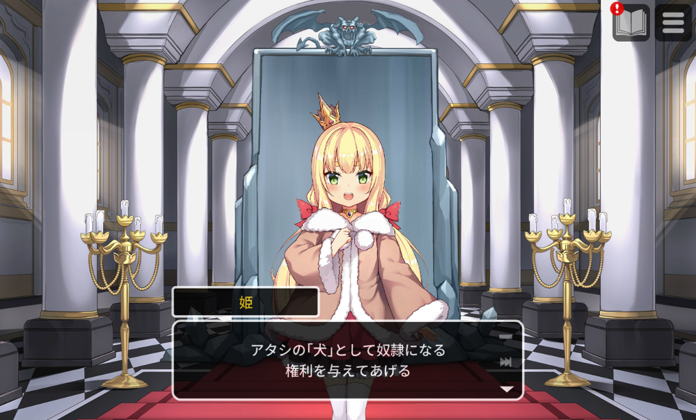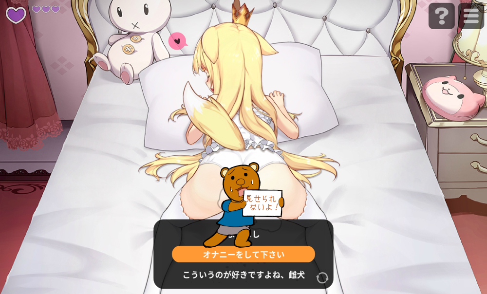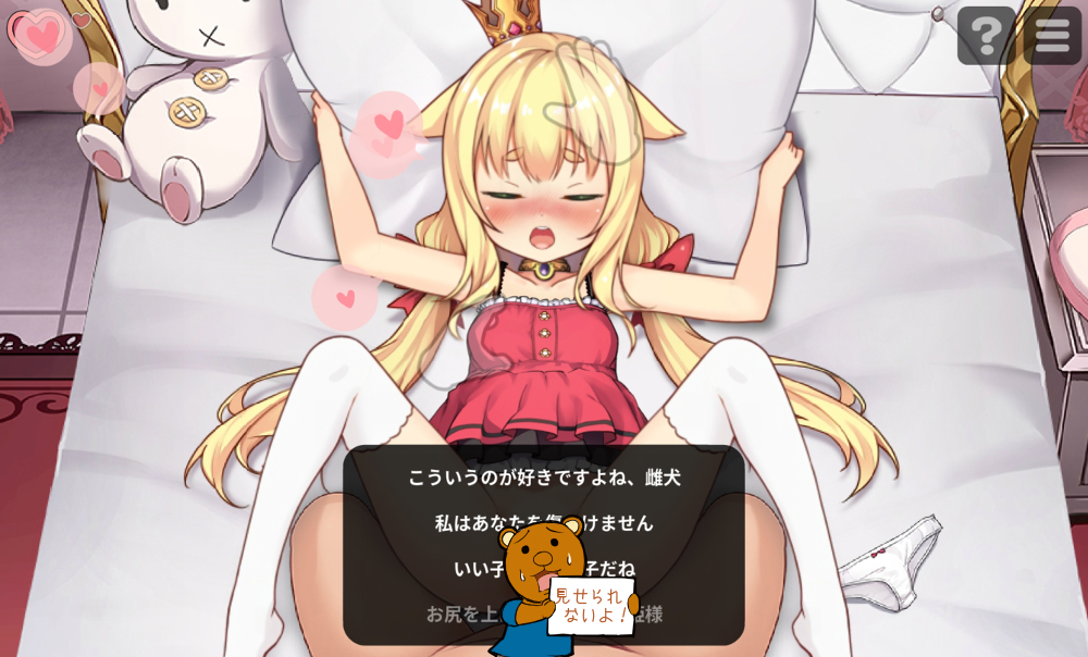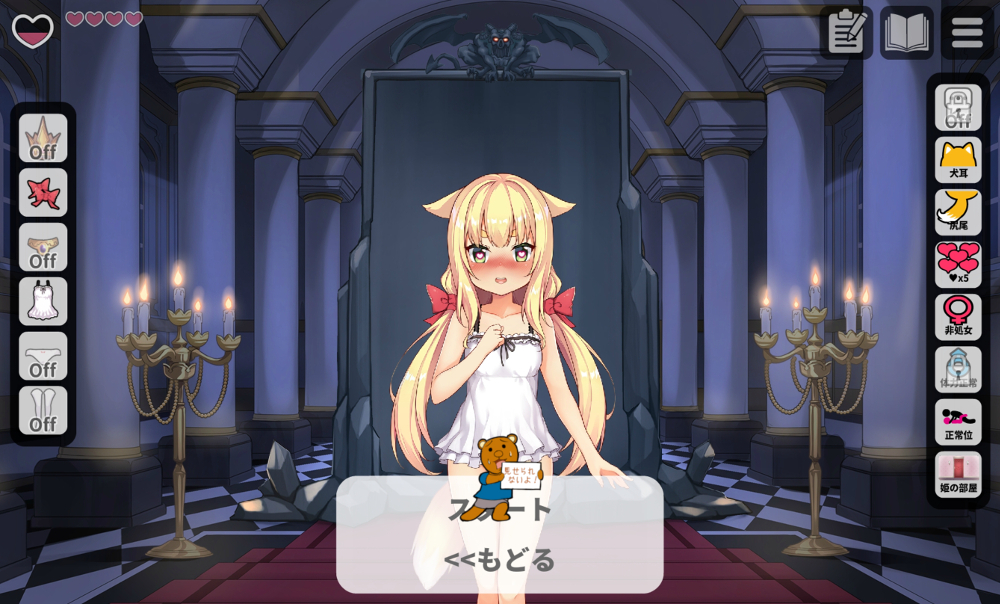 会話の中で姫ちゃんに対し強く当たる会話をすると服従度が上昇し、左上のハートマークが変化します。