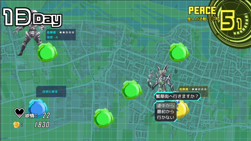 拠点画面では攻略を進めるか、それとも日常パートに進むかを選択でき、町の平和度を確認しつつ選択をしていく。
